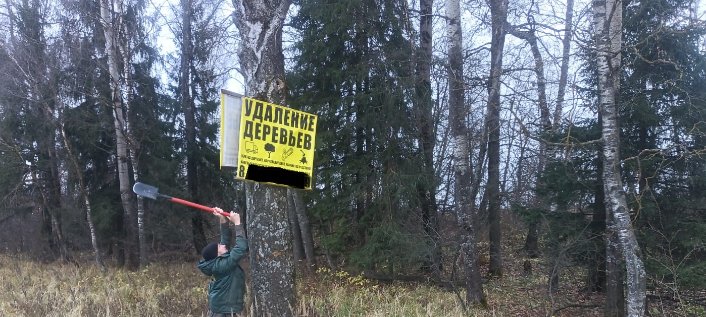 Сотрудники лесной охраны Веселевского участкового лесничества во время очередного рейда вблизи деревень Макаровка, Носово, Дудкино выявили и демонтировали 26 рекламных табличек, размещённых на деревьях.