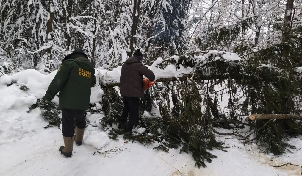 Сотрудники Песковского участкового лесничества Ступинского филиала ГАУ МО «Мособллес» недалеко от деревни Новосёлки городского округа Коломна обнаружили на дороге дерево, упавшее под тяжестью снега на проезжую часть.