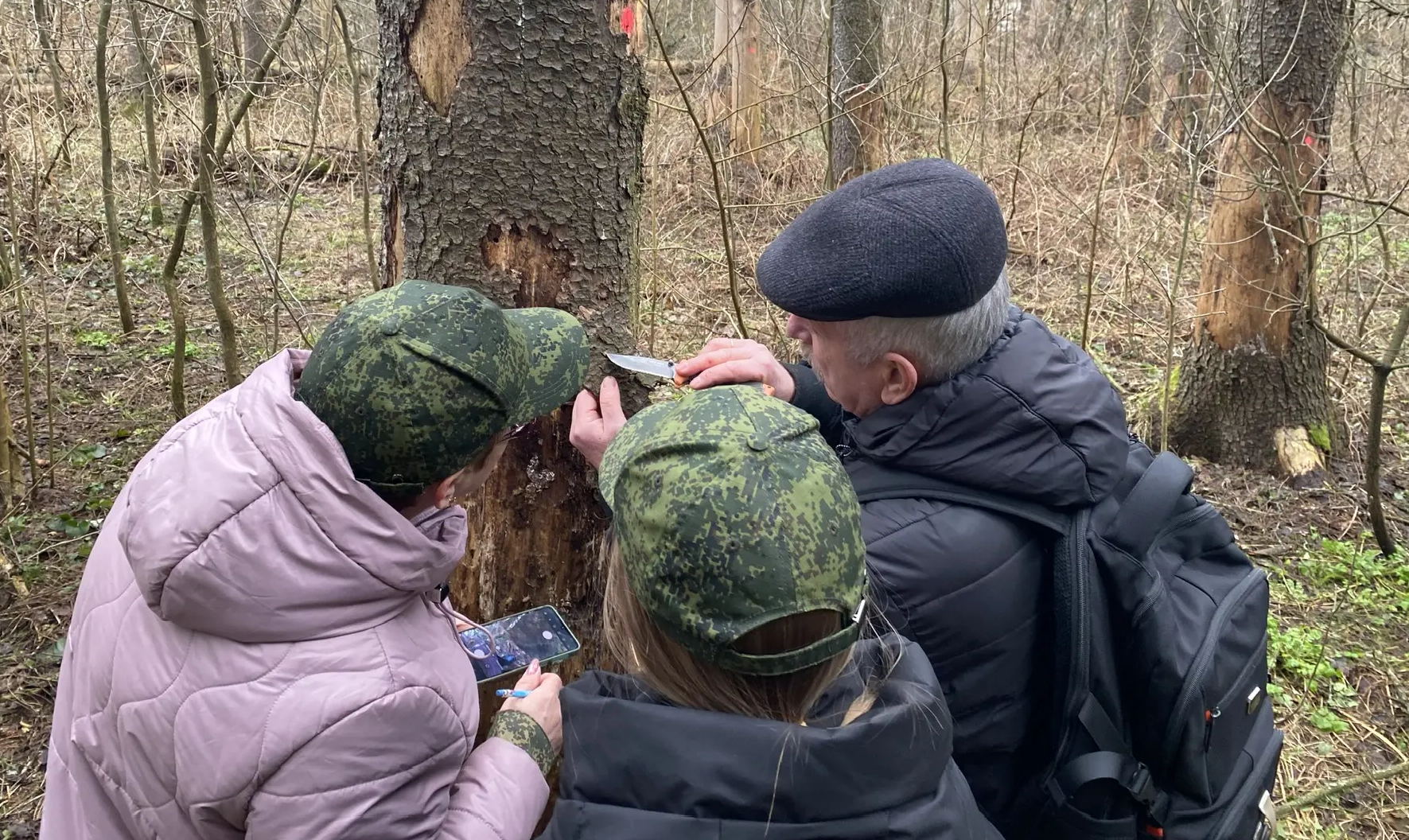 Гость с удовольствием поделился своими знаниями с юннатами, показал ребятам зимующего в коре дерева короеда-типографа, «оживил» короеда-типографа из феромонной ловушки, нашёл под корой хвойных деревьев личинок усача, муравьежука, златки. Кроме того, подробно рассказал о том, кем созданы ходы и отверстия на деревьях.