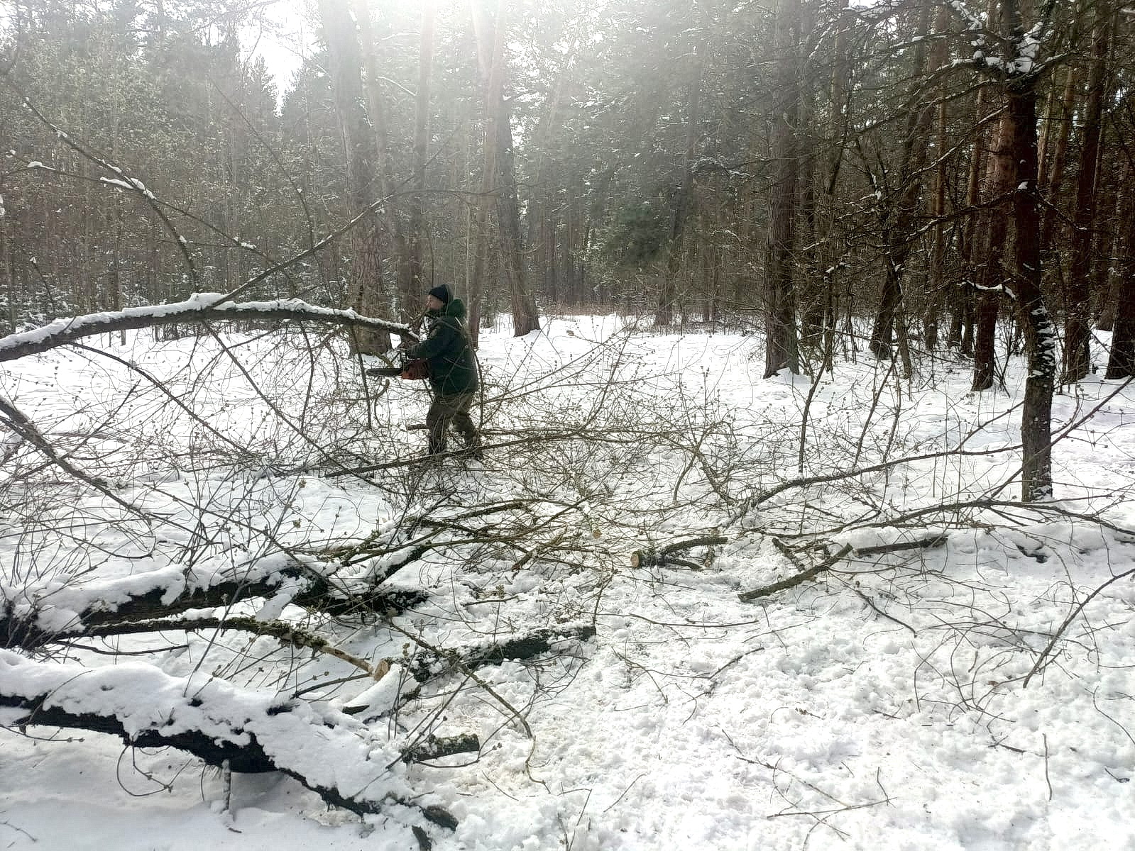 Во время патрулирования старшему участковому лесничему Шатовского участкового лесничества филиала «Русский лес» ГАУ МО «Мособллес» Евгению Кулакову путь преградило упавшее поперёк тропы дерево, не выдержавшее тяжести налипшего мокрого снега после прошедшего снегопада.