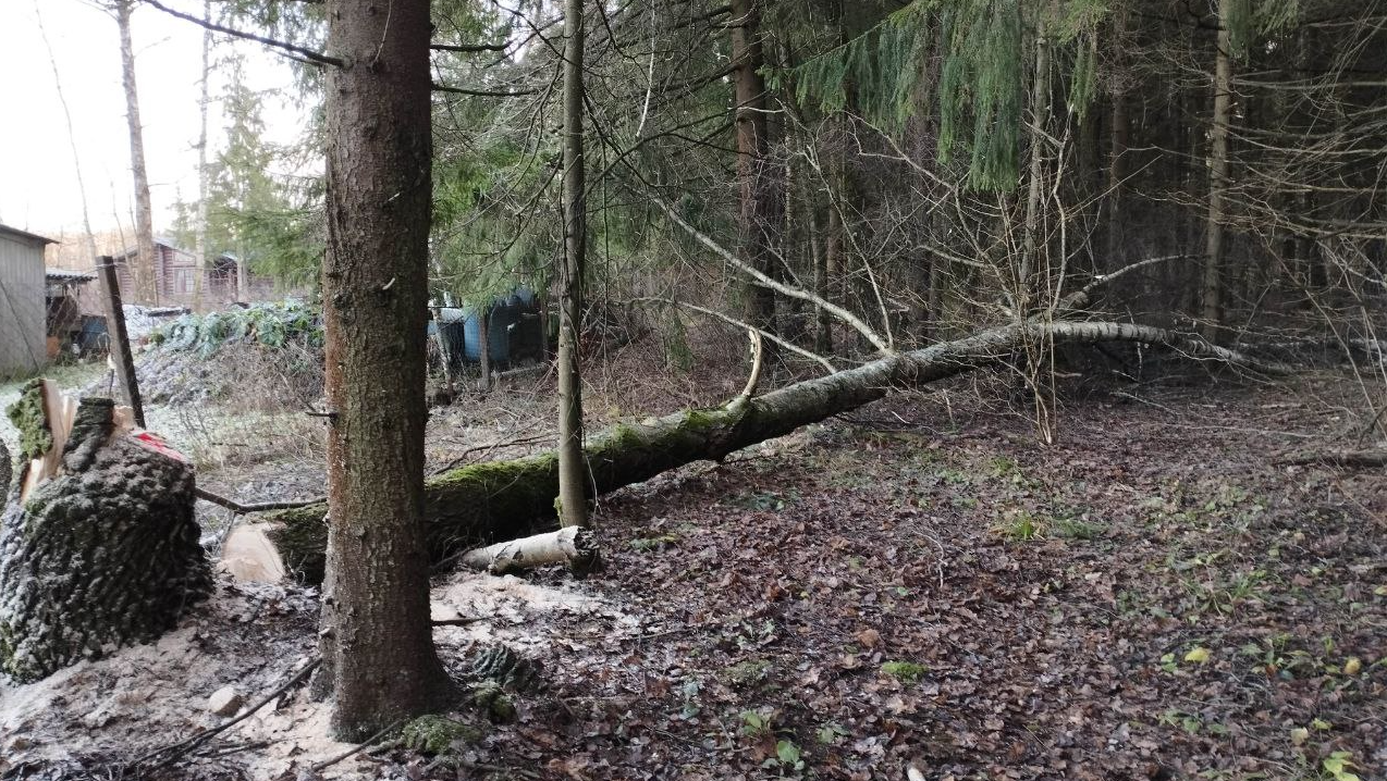 Ранее от местных жителей поступило сообщение о наличии опасных деревьев в лесном массиве рядом с СНТ. Были проведены работы по определению и маркировке деревьев с высокой вероятностью падения, составлен акт обследования аварийных деревьев. В рубку назначили 29 деревьев, имеющих повреждения и сильный наклон.