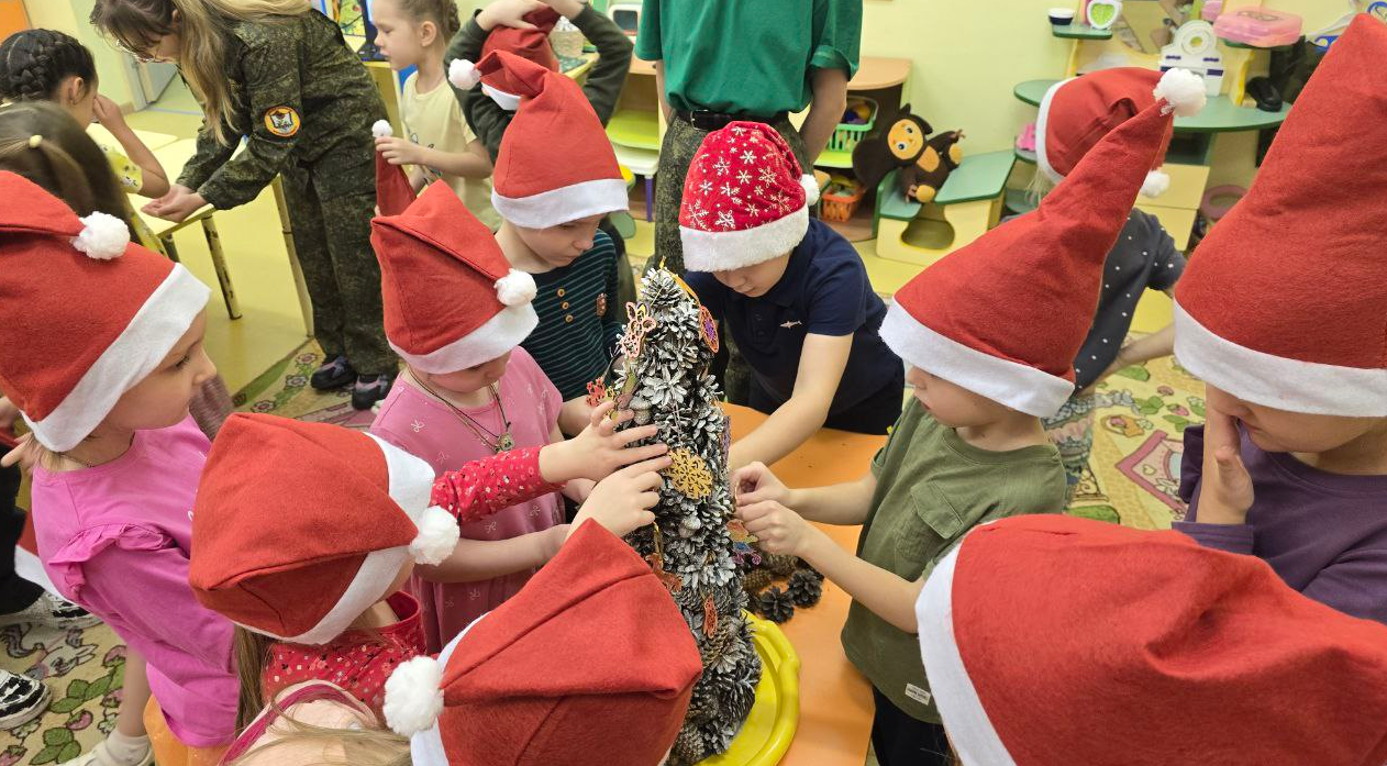 Для того, чтобы у малышей получился настоящий праздник, школьники принесли с собой ёлку, сделанную своими руками. Её веточки были шишками сосны обыкновенной, сосны веймутова, ели европейской, ели колючей, лиственницы сибирской и даже ольхи. Получилась уникальная дизайнерская ёлочка, пахнущая настоящим лесом.