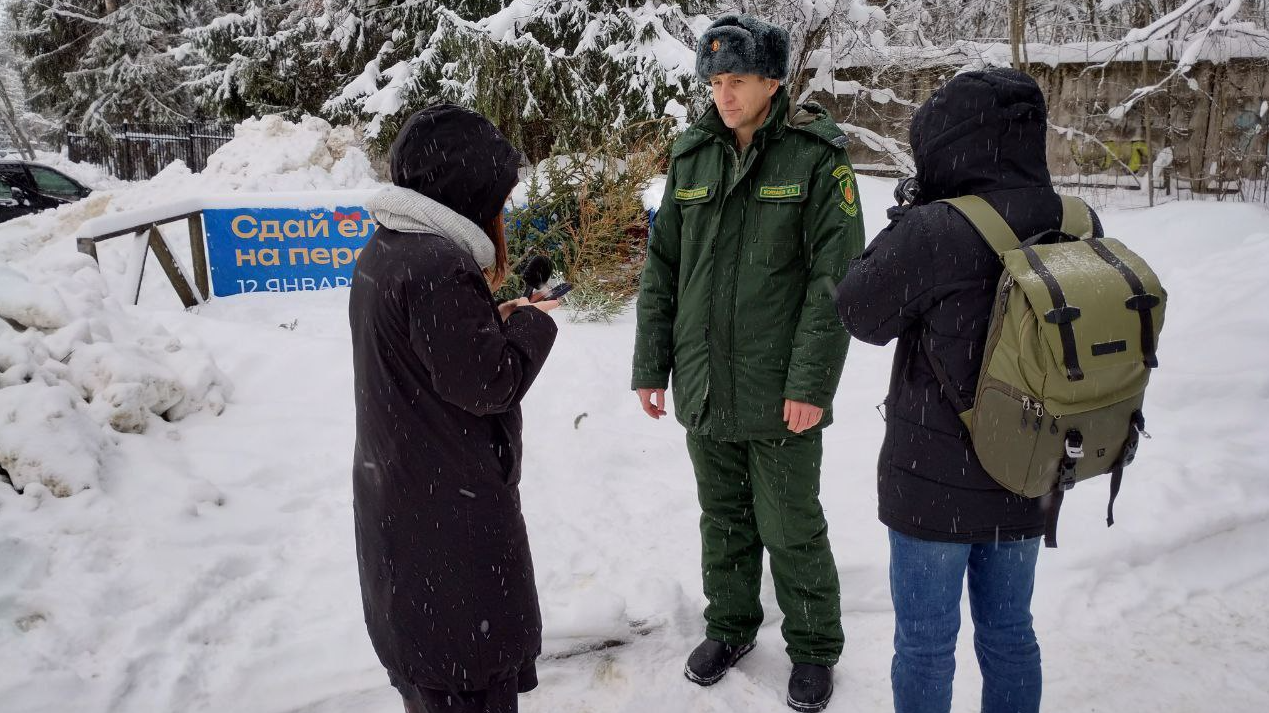 Старший участковый лесничий Сергиево-Посадского филиала ГАУ МО «Мособллес» Евгений Живаев вместе с корреспондентом местного телевидения призвали граждан принять участие в областной акции «Сдай на переработку и ёлки, и иголки!».