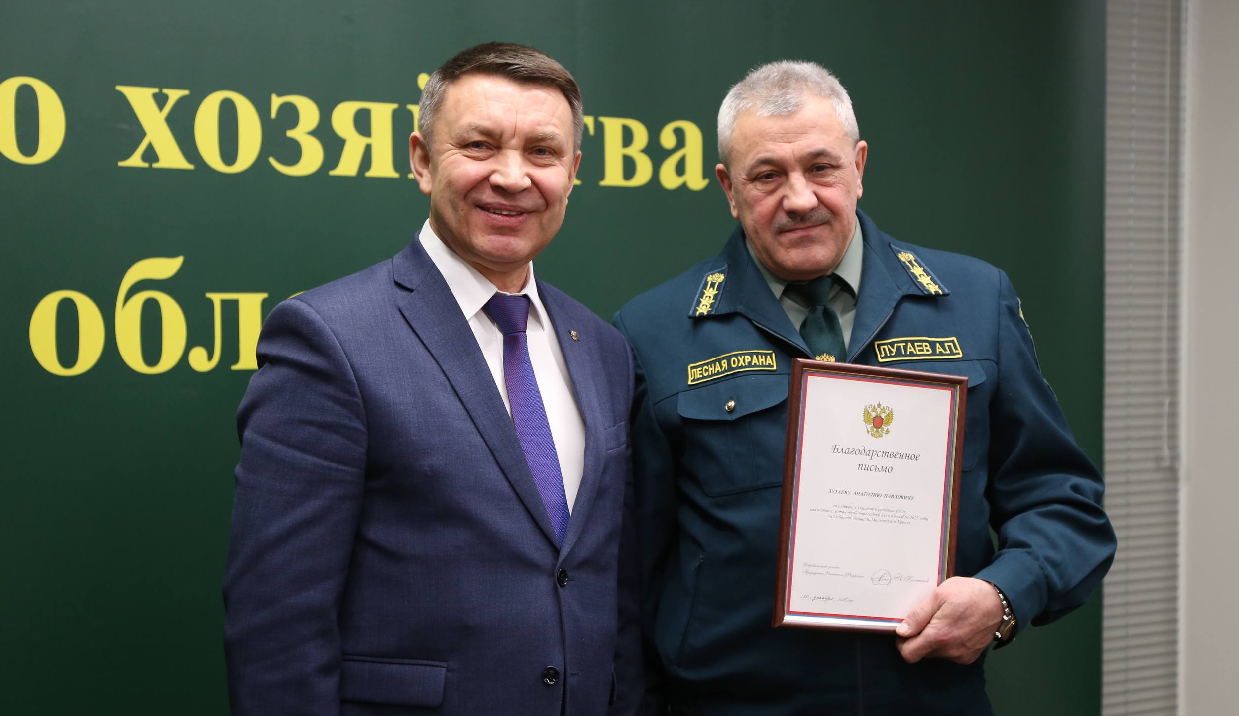 В Комитете лесного хозяйства Московской области вручены Благодарственные письма Управляющего делами Президента Российской Федерации должностным лицам, принявшим активное участие в решении задач, связанных с выбором и установкой новогодней ели в декабре 2025 года на Соборной площади Московского Кремля.