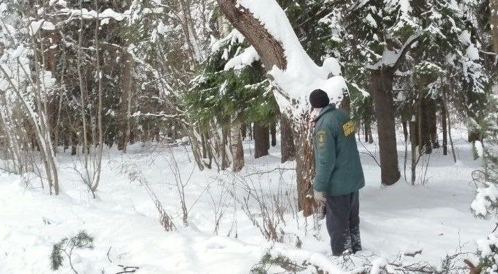 Ведущий инженер-лесопатолог Игорь Крайнов в присутствии старшего участкового лесничего Кристины Колесовой и председателя СНТ установил аварийное состояние двух деревьев.