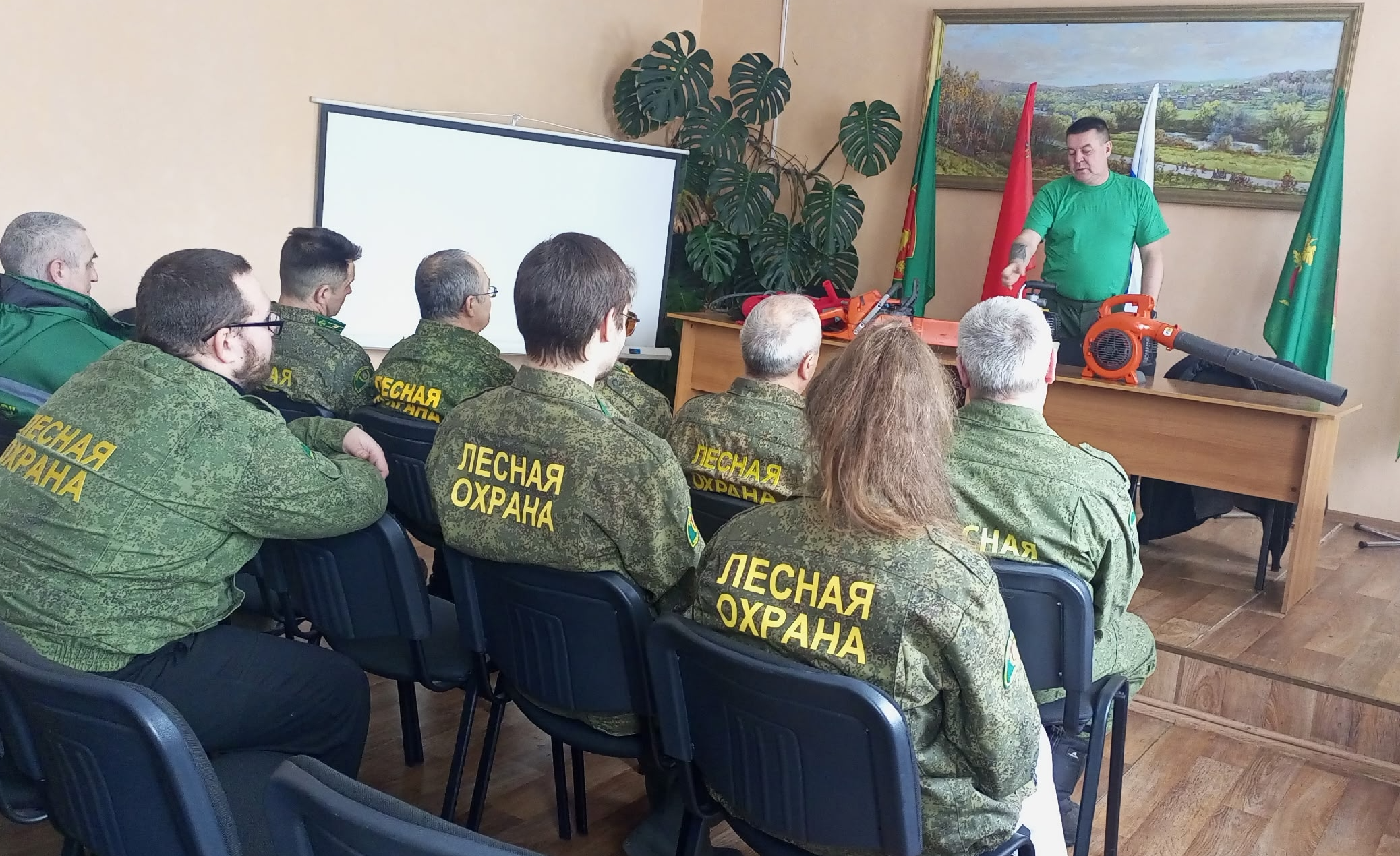 Старший участковый лесничий Алексей Калинин напомнил коллегам, как правильно пользоваться ранцевым лесным огнетушителем РП-18 «Ермак», зажигательным аппаратом «АЗ-4», лесопожарной ранцевой установкой «Ангара», мотопомпами.